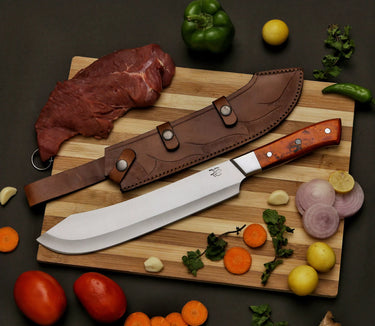This heavy-duty cleaver is handmade, designed to easily chop meat and bone with ease. The included leather sheath lets you protect and store your tool safely. The blade is stainless steel, giving you peace of mind about corrosion. The heft of the cleaver allows you to cut through bone as easily as a hot knife through butter.