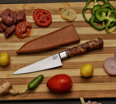 This Petty Knife is the perfect tool for precise cutting tasks. Crafted from stainless steel with a high-quality resin handle, this knife is designed to provide superior balance and control for expert cutting. The included leather scabbard ensures safe storage when not in use.