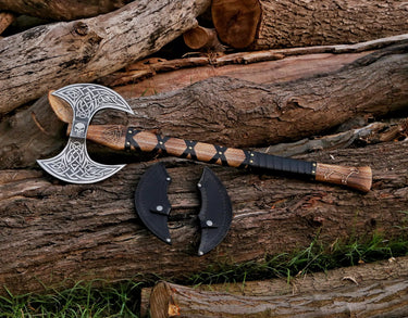 The handle of this Viking axe is crafted from Ashwood, reflecting the timeless elegance of natural materials. The ergonomic design provides a comfortable grip, allowing for precise control and effortless swings. Perfectly balanced and proportioned, this Viking Style Axe is both a functional tool and a work of art. Whether displayed proudly on a wall or swung valiantly in action, it embodies the spirit of history and craftsmanship. Embrace the legacy of the ancient Vikings with this remarkable handmade axe, a symbol of power, prowess, and adventure. Handmade genuine leather sheaths are included with all of our axes.