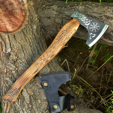 The handle of this Viking axe is crafted from Ashwood, reflecting the timeless elegance of natural materials. The ergonomic design provides a comfortable grip, allowing for precise control and effortless swings. Perfectly balanced and proportioned, this Viking Style Axe is both a functional tool and a work of art. Whether displayed proudly on a wall or swung valiantly in action, it embodies the spirit of history and craftsmanship. Embrace the legacy of the ancient Vikings with this remarkable handmade axe, a symbol of power, prowess, and adventure. Handmade genuine leather sheaths are included with all of our axes.