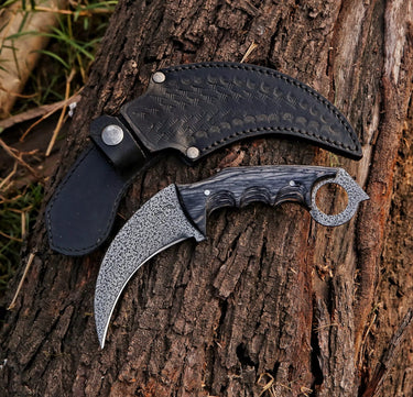 The distinctive Karambit design, originating from Southeast Asia, boasts a curved blade that resembles a tiger's claw. For the utmost convenience and protection, this knife is accompanied by a carefully hand-stitched leather sheath. The sheath not only keeps the blade safely secured but also adds an element of elegance.