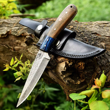 Expertly crafted with a Damascus steel blade, this skinning knife is perfect for precise and effortless skinning. Its sharp edge and ergonomic design make it a valuable addition to any hunting or outdoor gear. Comes with a durable black leather sheath for safe storage and accessibility.