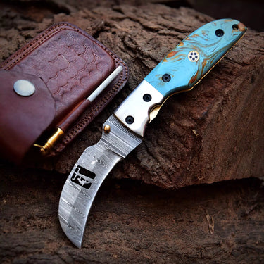 This blade is a masterpiece of craftsmanship and nature's elegance. The blade's flowing Damascus patterns ensure sharpness and durability. This exceptional knife comes with a leather sheath for convenient carry and safe storage. Compact and reliable, it's a true treasure for outdoor enthusiasts and collectors alike.