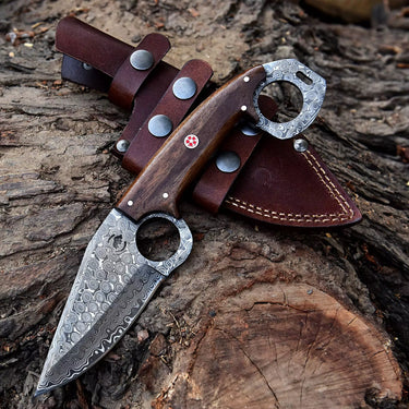 Featuring a one of a kind handle design optimized for great control while skinning an animal. The two rings implemented on the handle and blade ensure no slippage in wet conditions and extra leverage when needed. Included is a scout carry leather sheath with options for both a horizontal and vertical belt carry. The blade is crafted from expertly forged Damascus steel which is complimented with an alluring rosewood handle.