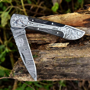 Expertly crafted with a black dyed rosewood handle and a damascus blade, this folding knife is a practical and stylish addition to any collection. Its compact size makes it perfect for everyday carry while its durable materials ensure long-lasting use. A must-have for any knife enthusiast.