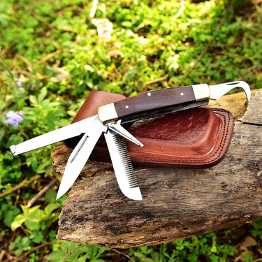 Crafted from premium Stainless steel, this EDC folding knife offers exceptional strength and sharpness. With a compact design and leather sheath, it's your perfect on-the-go tool. The Safety-lock feature and elegant craftsmanship make it an unforgettable gift. Get yours now!