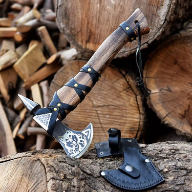 Great as a throwing axe or a display piece. Features a beautiful acid engraved carbon steel blade and an Ashwood handle. A leather case for the blade is included.
