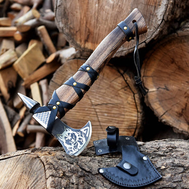 The handle of this Viking axe is crafted from Ashwood, reflecting the timeless elegance of natural materials. The ergonomic design provides a comfortable grip, allowing for precise control and effortless swings. Perfectly balanced and proportioned, this Viking Style Axe is both a functional tool and a work of art. Whether displayed proudly on a wall or swung valiantly in action, it embodies the spirit of history and craftsmanship. Embrace the legacy of the ancient Vikings with this remarkable handmade axe, a symbol of power, prowess, and adventure. Handmade genuine leather sheaths are included with all of our axes. Acid etched blade. Fit in back pack and loop with belt.