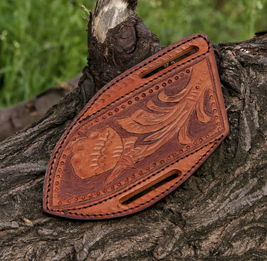 Introducing our Pancake Leather Sheath – a marriage of tradition and innovation for your blade's protection. Crafted from premium leather, this sheath offers durability that speaks of your journeys. The snug pancake design ensures a secure fit, while stitched seams provide reinforcement. A belt loop allows convenient attachment to your belt, making your blade easily accessible whether you're outdoors or tackling daily tasks.